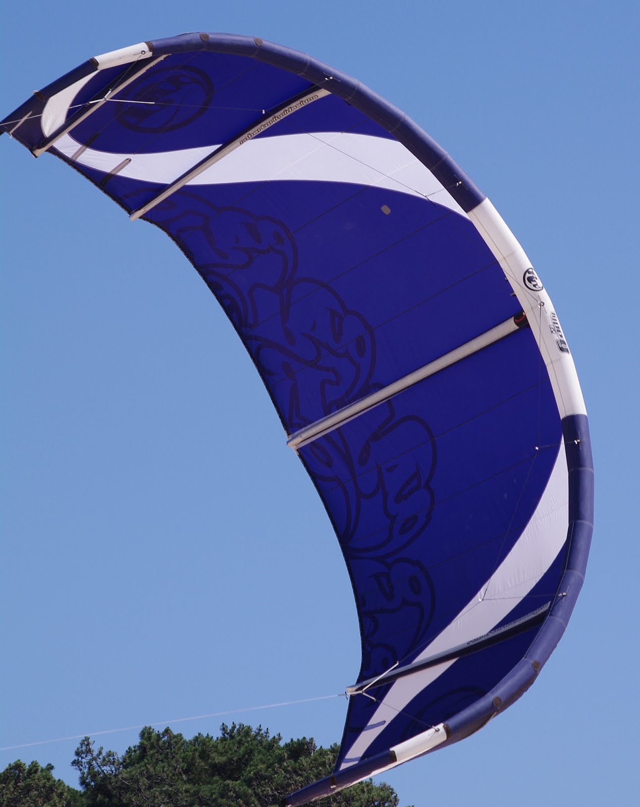 C'est un RRD Type9 de 2008 (acheté Octobre 2008) em 12m, complete avec barre. Il a petre des traces de sable et sel, mais sinon, il y a juste un petit patch a signaler sur le spi (pour couvrir un micro trou que doit faire un ou deux milimetres, visible sur la photo - cliquer pour voir plus grand). La barre et lignes sont en bon etát, j'ai juste remplacé le tchouch (cassé) pour un tchouch Ozone, plus costaud.